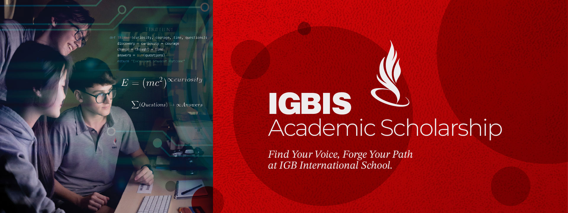 The IGBIS Academic Scholarship recognises and supports students who demonstrate exceptional academic achievement, intellectual curiosity, and a sustained commitment to learning. This scholarship is designed for students who will contribute positively to the academic culture of the school and serve as role models of scholarship, integrity, and balanced engagement. Academic Scholars are expected to enrich our community, uphold high standards, and inspire others through their example.